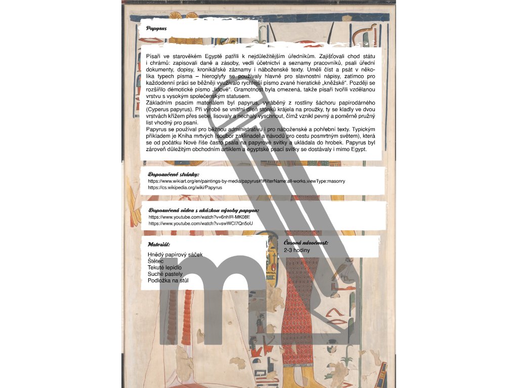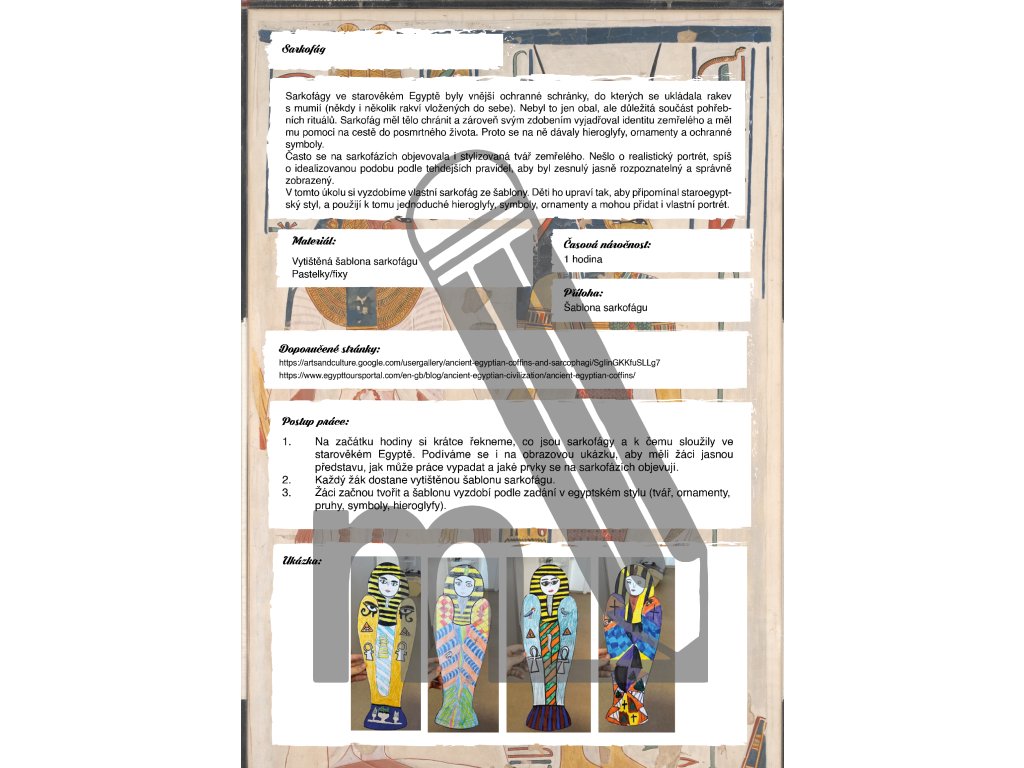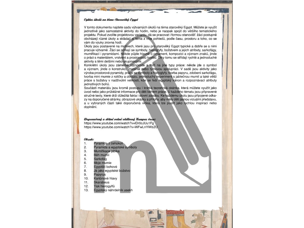 Materiál obsahuje 13 výtvarných úkolů pro žáky 1. i 2. stupně základní školy, které lze využít samostatně nebo propojit do většího tematického celku. Žáci si vyzkouší například tvorbu papyru, tisk hieroglyfů z brambor, zdobení sarkofágu i experiment s mumifikací jablka.