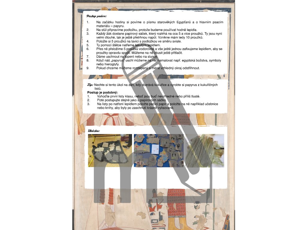 Součástí souboru jsou stručná teoretická okénka, přehledné postupy, seznamy pomůcek, časová náročnost jednotlivých aktivit, obrazové ukázky i přílohy k tisku. Aktivity rozvíjejí kreativitu, dávají prostor k experimentování s různými materiály a podporují spolupráci mezi žáky. Zároveň děti přirozeně vedou k hlubšímu pochopení starověkého Egypta prostřednictvím vlastní tvorby.