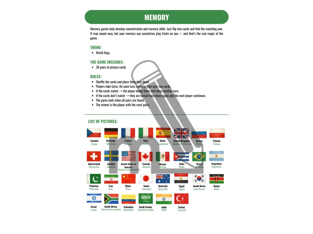 Oblíbená hra, která nikdy nezklame! Žáci si při hledání dvojic procvičí nejen paměť a soustředění, ale zároveň si zábavnou formou osvojí anglická slovíčka k danému tématu.
