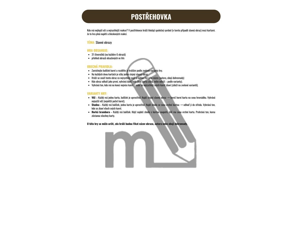 Kdo má nejlepší oči a nejrychlejší reakce? V postřehovce hráči hledají společný symbol (v tomto případě slavný obraz) mezi kartami. Je to hra plná napětí a bleskových reakcí.