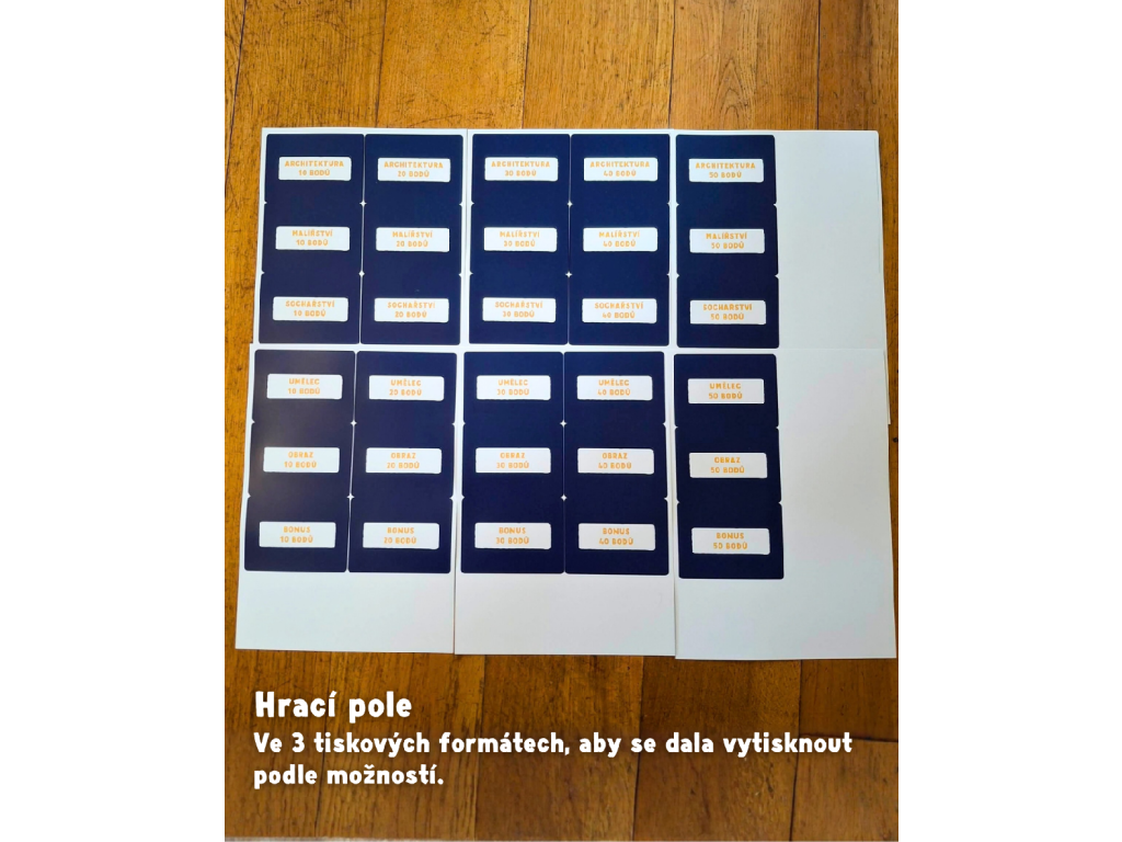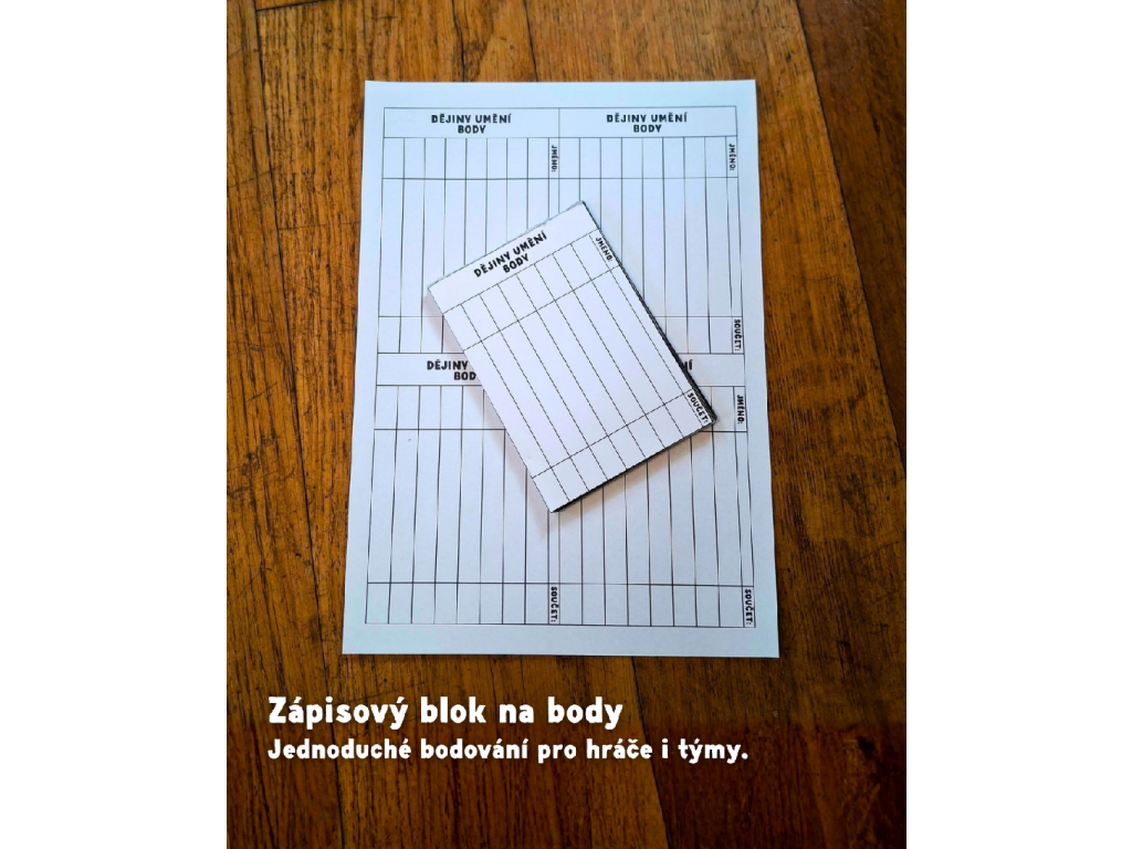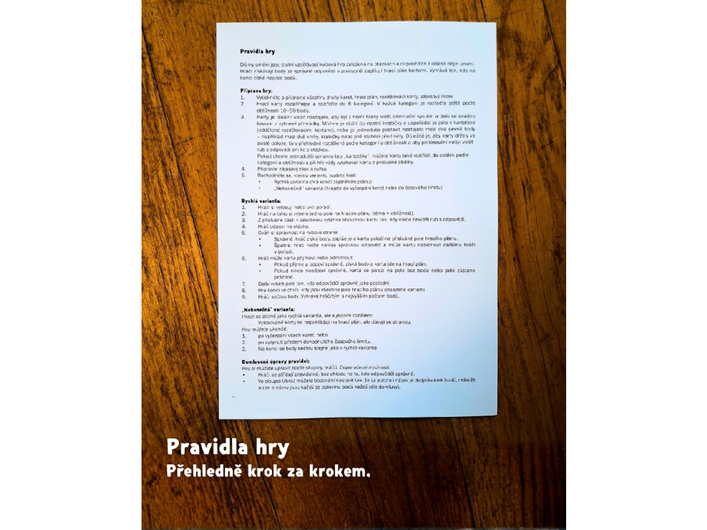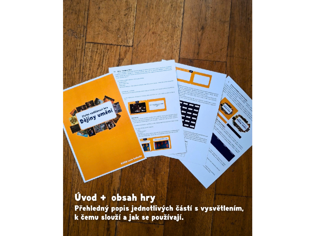 Dějiny umění jsou stolní vzdělávací kvízová hra, která rozvíjí a prohlubuje znalosti z oblasti dějin umění pomocí systému otázek a odpovědí. Hráči si vybírají témata a obtížnost, odpovídají na otázky nebo poznávají umělecká díla a za správné odpovědi získávají body. Dějiny umění jsou stolní vzdělávací kvízová hra, která rozvíjí a prohlubuje znalosti z oblasti dějin umění pomocí systému otázek a odpovědí. Hráči si vybírají témata a obtížnost, odpovídají na otázky nebo poznávají umělecká díla a za správné odpovědi získávají body. Hra je vhodná pro studenty a školní výuku, stejně jako pro všechny, kdo si chtějí hravou formou rozšířit přehled v kunsthistorické oblasti a získat jistotu v autorech, dílech, pojmech i souvislostech. Zároveň nabízí přirozený způsob učení: díky opakování, okamžité zpětné vazbě a zapojení soutěživosti si hráči nové informace snáz zapamatují a lépe je propojí do souvislostí.