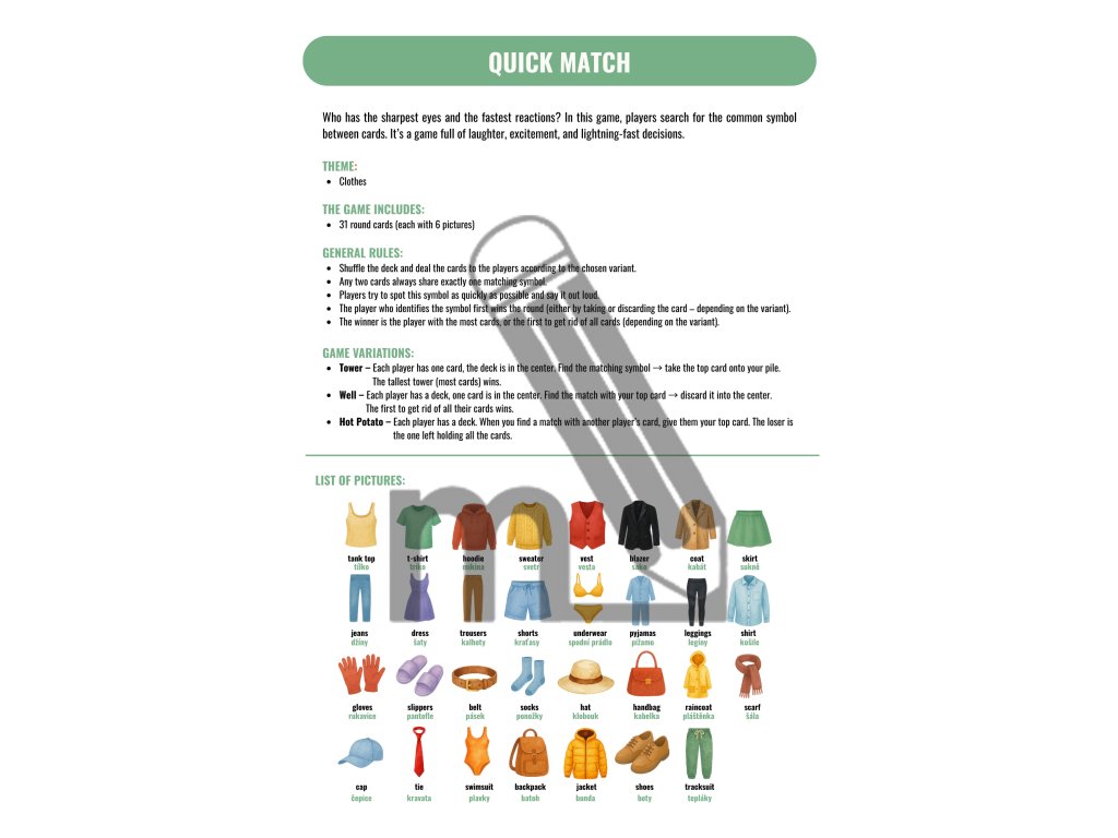 Rychlost, postřeh a spousta legrace! Hráči hledají shodné symboly a při tom si neustále opakují anglická slovíčka k danému tématu. Hra plná smíchu, která procvičí slovní zásobu i bystré oko.