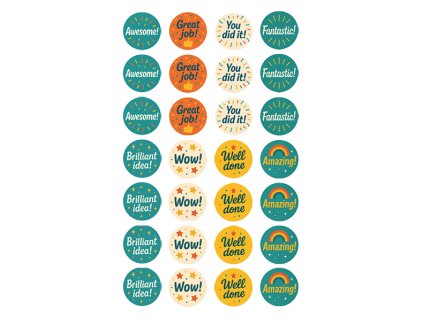 Úsměv, pochvala i motivace v jednom. Samolepky s povzbuzujícími slovy, které potěší malé i větší školáky. Protože chvály není nikdy dost! Průměr 25 mm. Celkem 28 ks na jedné...