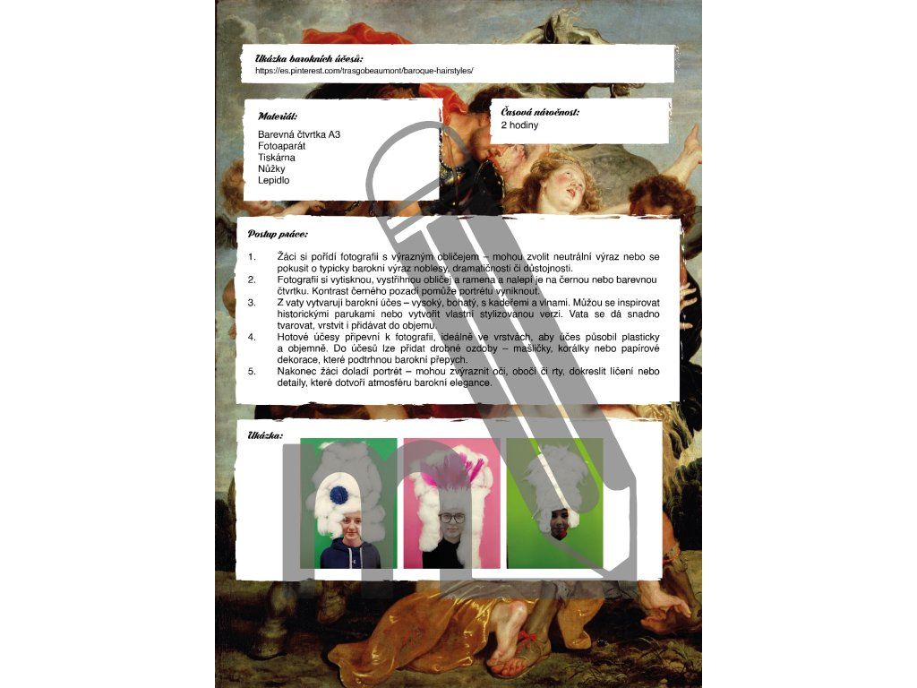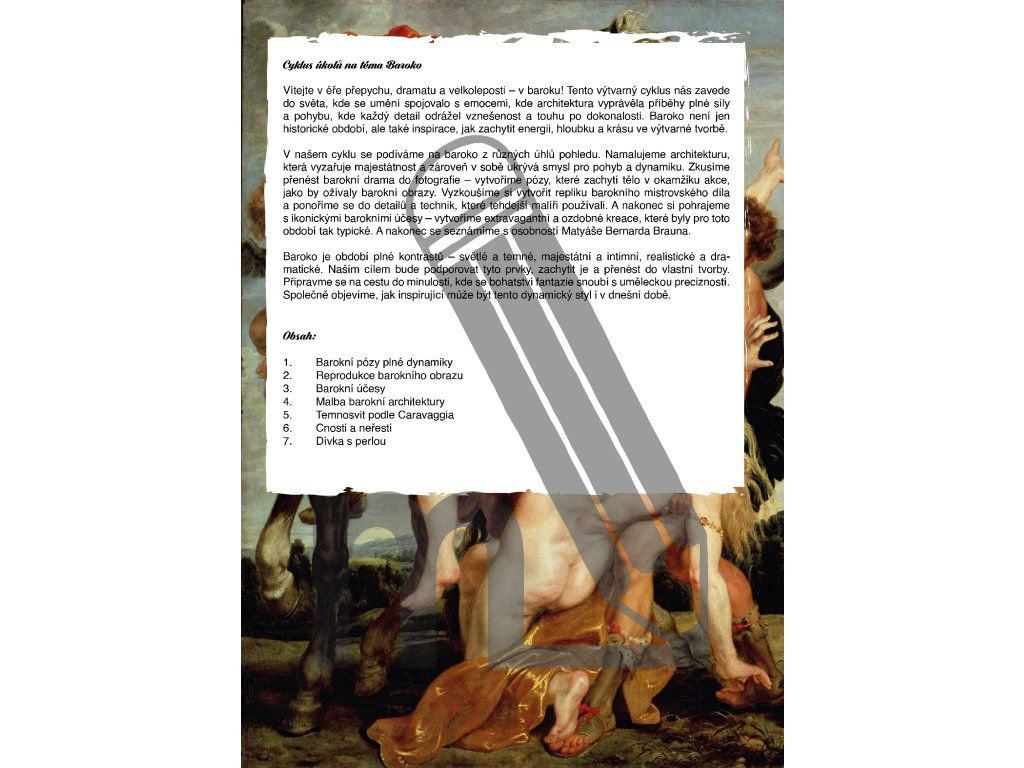 Materiál obsahuje 7 výtvarných úkolů pro žáky 2. stupně základní školy. Ti si vyzkouší například barokní pózy zachycené fotografií, tvorbu portrétu s extravagantním barokním účesem i malbu monumentální architektury.