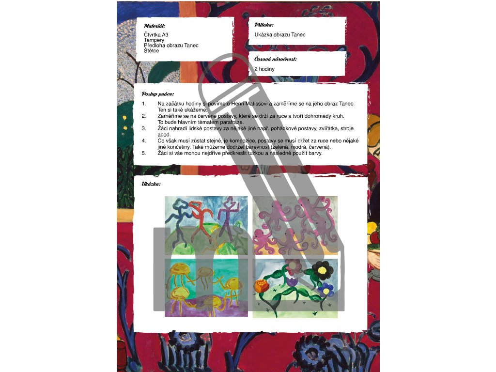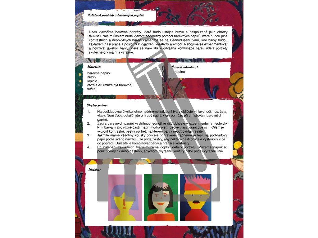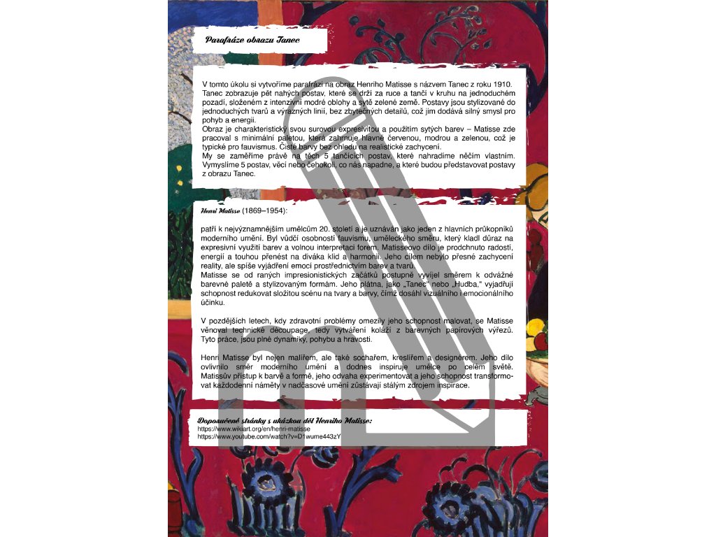 Materiál obsahuje 7 výtvarných úkolů pro žáky 1. i 2. stupně základní školy. Žáci si vyzkouší například parafrázi obrazu Tanec, vytvoří fauvistické zvíře a seznámí se také s papírovými kolážemi inspirovanými Henri Matissem. V jednotlivých úkolech budeme pracovat s výraznými a netradičními odstíny, podobně jako fauvisté, a vytvoříme díla plná energie, síly a barevné harmonie.