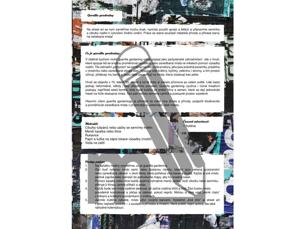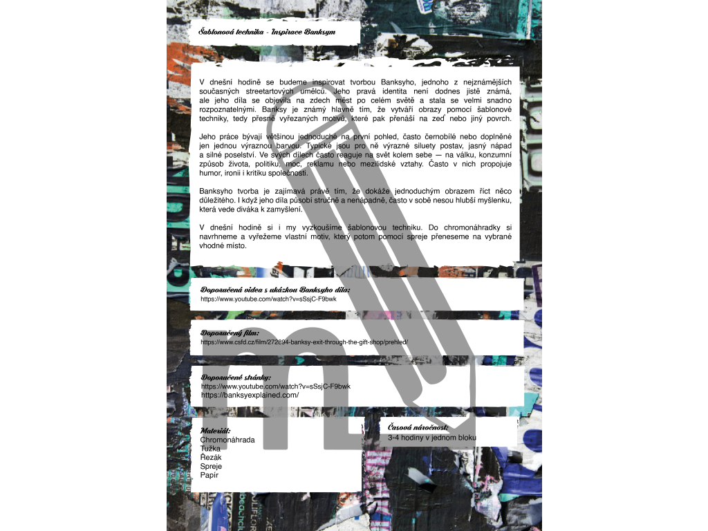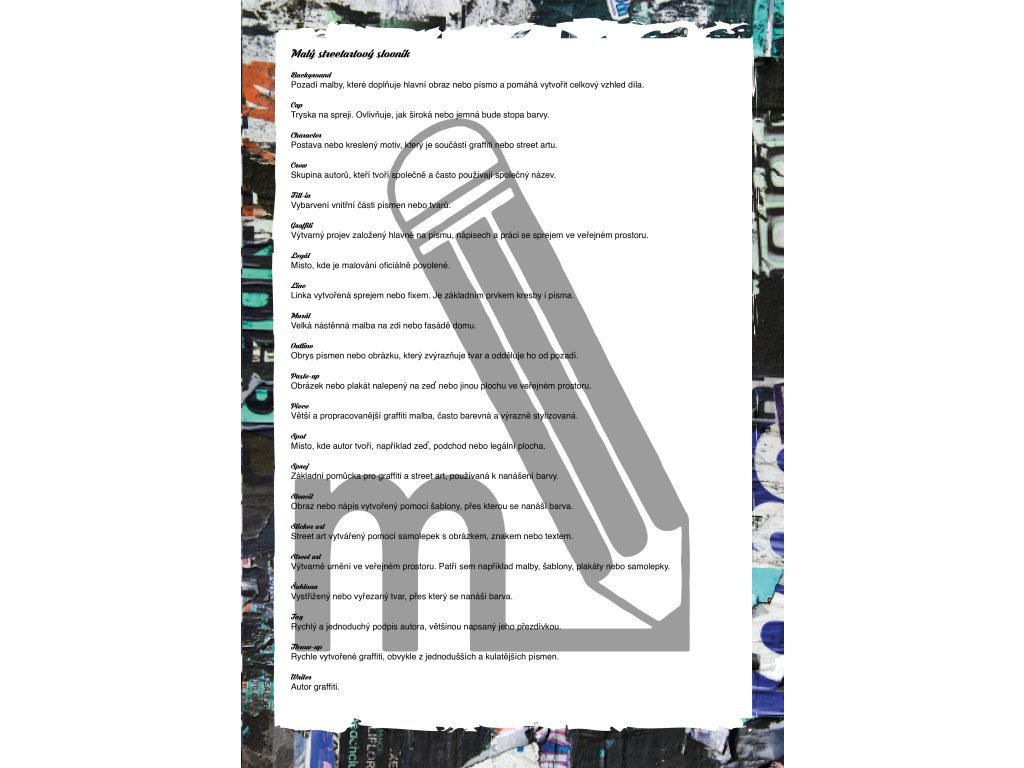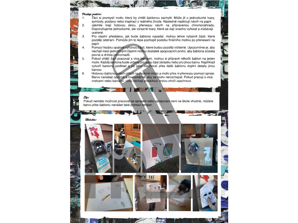 Součástí souboru jsou stručná teoretická okénka, streetartový slovníček, přehledné postupy, seznamy pomůcek, časová náročnost jednotlivých aktivit, obrazové ukázky i přílohy k tisku.