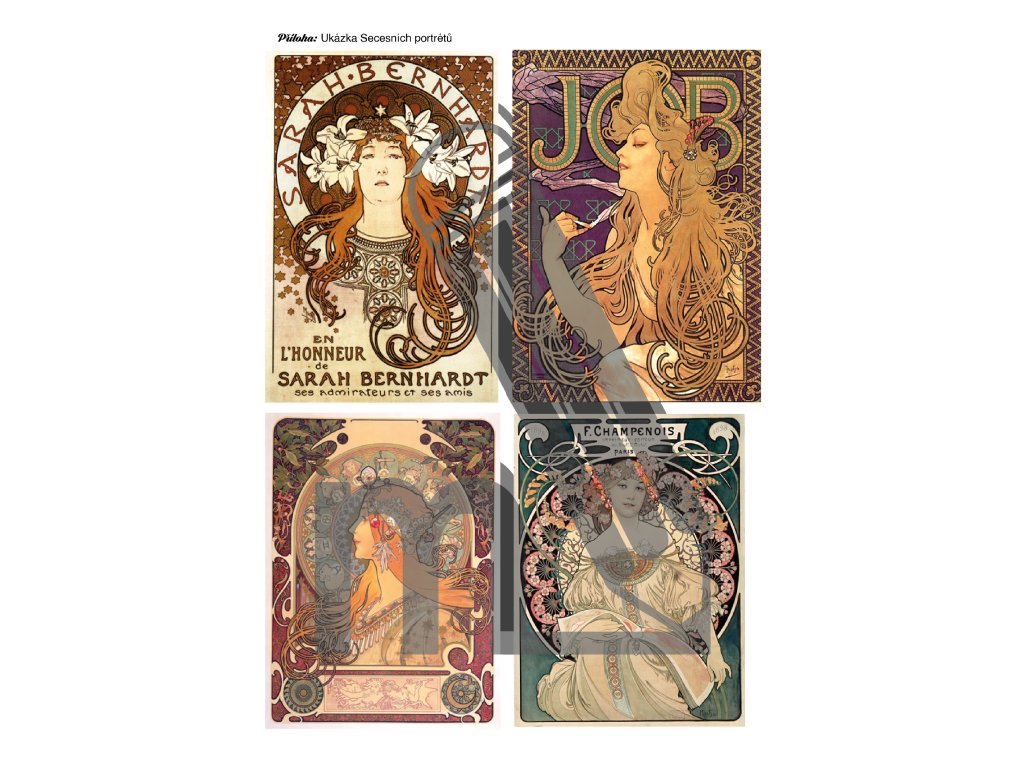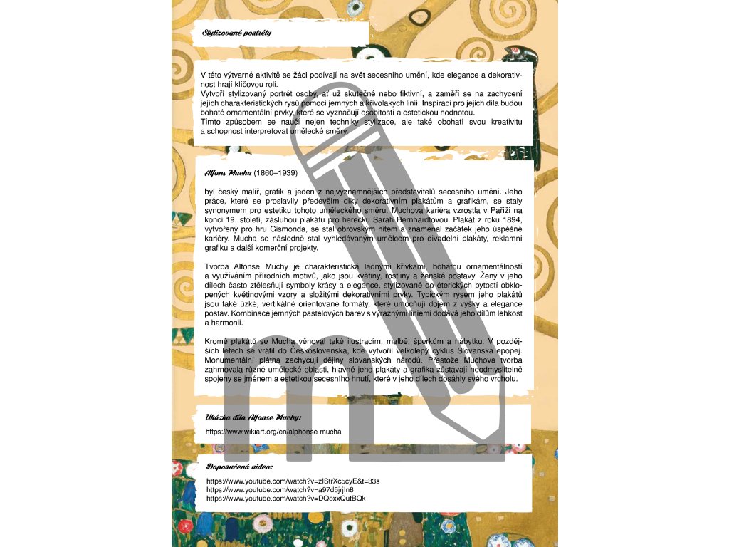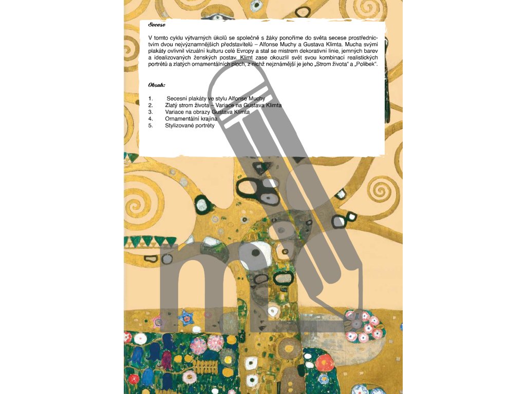 Soubor dále obsahuje stručné teoretické okénko, které žákům představí vznik secese, její hlavní znaky i nejvýznamnější osobnosti tohoto uměleckého směru. Nechybí přehledné postupy práce, seznamy pomůcek, časová náročnost jednotlivých úkolů ani obrazové ukázky žákovských prací.