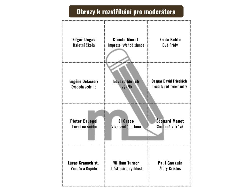 Perfektní trénink paměti a soustředění. Hráči si musí v krátkém čase zapamatovat rozložené karty se slavnými obrazy a poté určit, které z nich zmizely, nebo správně poskládat původní pořadí. Hra, která prověří pozornost a bystrou mysl.